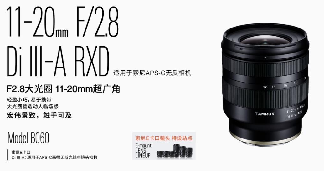 大光圈超廣角,追求新的體驗11-20mm F/2.8 Di III-A*1 RXD(型號 B060)擁有全焦段F2.8大光圈,同時具備出色的便攜性,是一支適用于索尼E卡口APS-C畫幅無反相機的大光圈超廣角變焦鏡頭。大光圈有助于在昏暗拍攝場景中提高快門速度,防止抖動,以便獲得畫面銳利的照片。特殊材質鏡片經優化配置,良好矯正各種像差,帶來清晰畫質與高解析性能。憑借令人驚嘆的輕便與緊湊,日常使用不在話