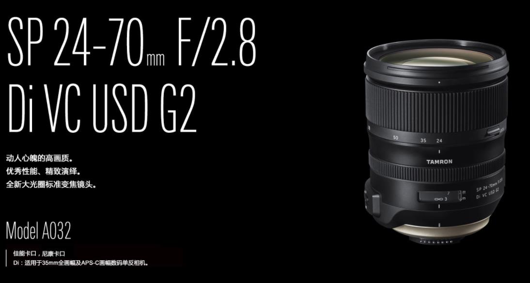 全新的F/2.8大光圈標準變焦鏡頭SP 24-70mm F/2.8 Di VC USD G2(型號A032),擁有高畫質,以及對應新型高像素數碼相機的先進性能。eBAND擴展頻寬多角度防反射鍍膜,強力抑制逆光時易發生的眩光和鬼影。配備高速精確的自動對焦技術,以及同級領先的5檔*1防抖。防污涂層和簡易防滴構造適于戶外使用,遮光罩鎖定裝置提高了便利性。可靈活用于風景、人像、新聞報道等多種拍攝場合。